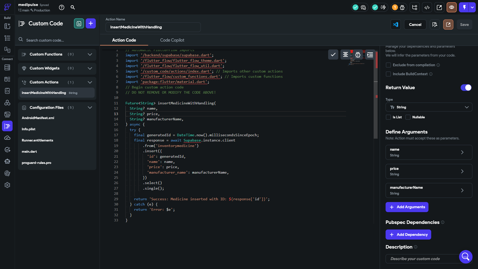 The recommended and most flexible solution is to encapsulate the Supabase operation within a FlutterFlow Custom Action. Create a custom action (e.g.,insertMedicineWithHandling ) that accepts the necessary data (like the details for your inventorymedicinetable) as input parameters. Inside the custom action's Dart code, you will use the Supabase Dart client, accessible via Supabase.instance.client .