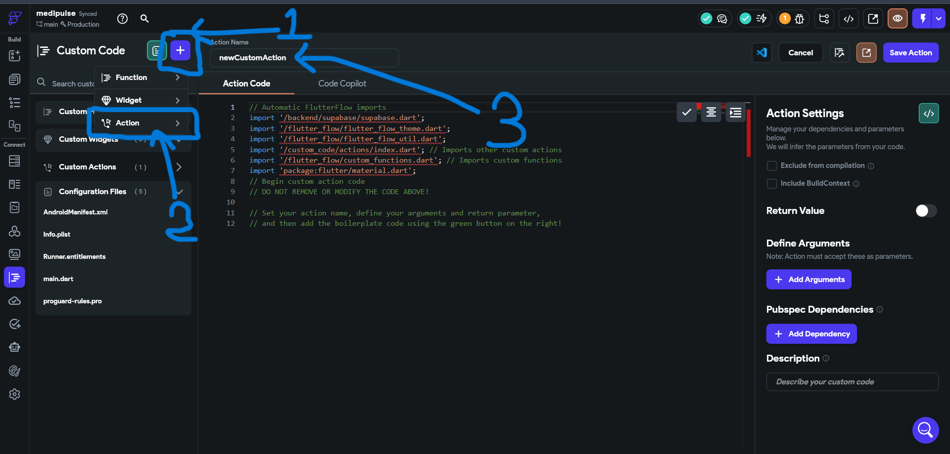 Follow the steps to create a custom flutterflow action: